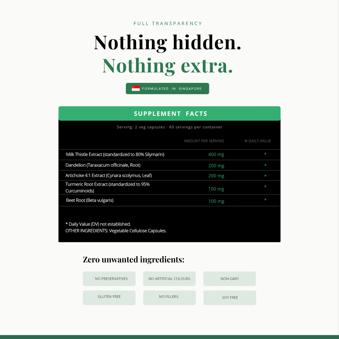 Packed with Milk Thistle Extract standardized to 80% Silymarin, complemented by a blend of Dandelion, Beet, Artichoke, and Turmeric, this formula ensures optimal liver function and overall health.