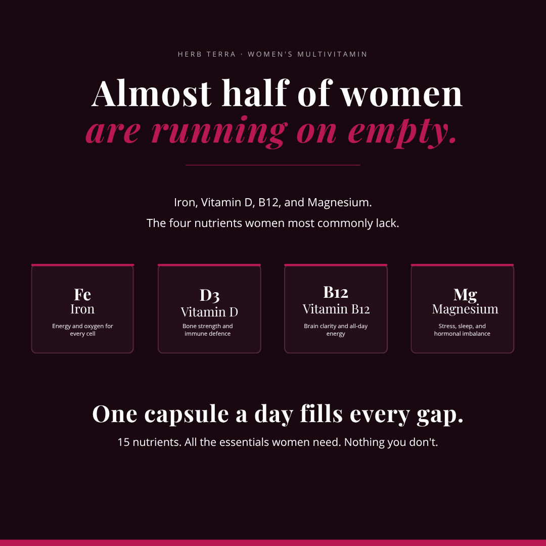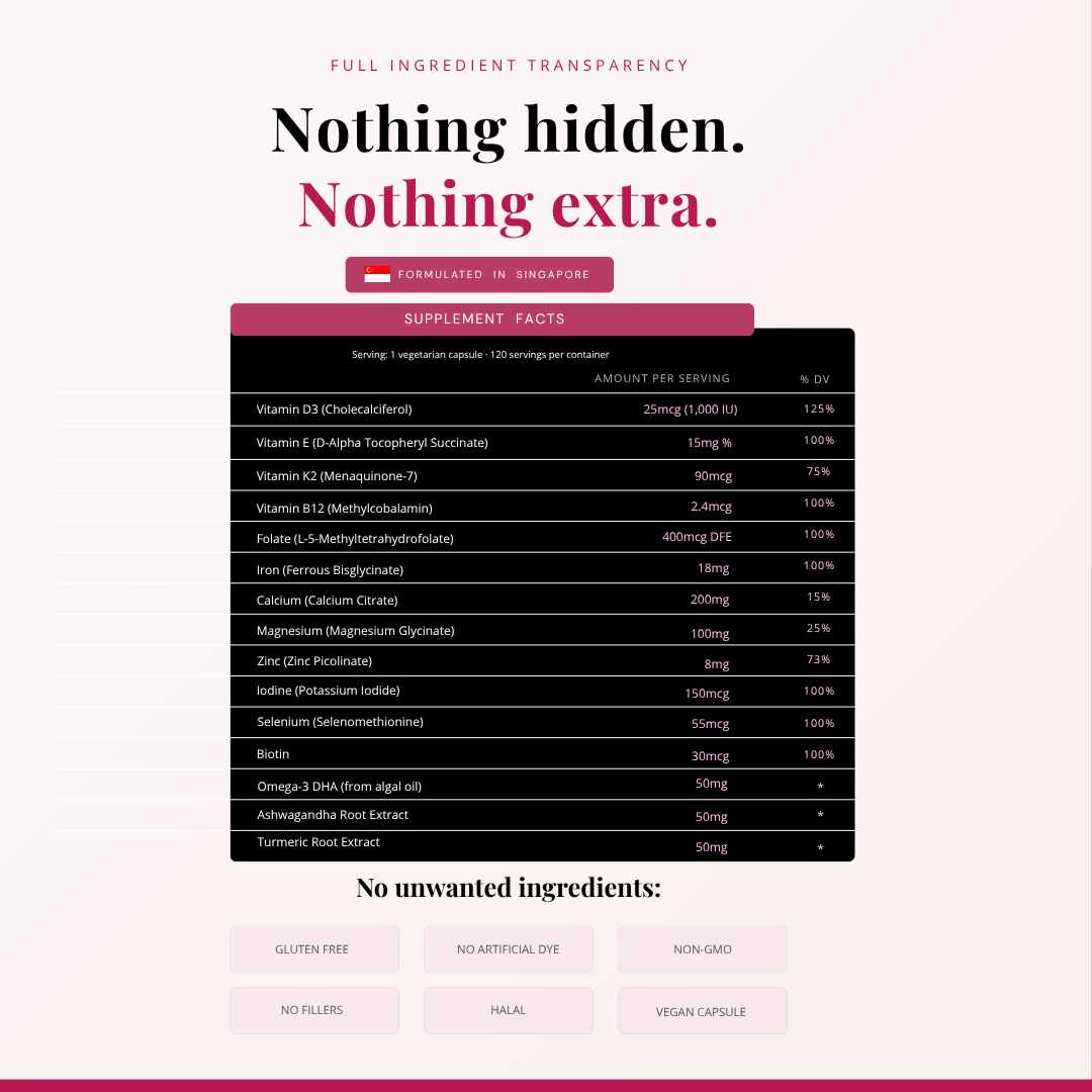Iron deficiency affects roughly 1 in 4 women of reproductive age, often without a clear diagnosis. Vitamin D insufficiency is even more common in Singapore. B12 and magnesium round out the four most commonly under-fuelled nutrients for women. Most of us have been told to "eat a balanced diet" and left to figure it out. This formula is the nutritional safety net that doesn't require a 4-bottle morning ritual.