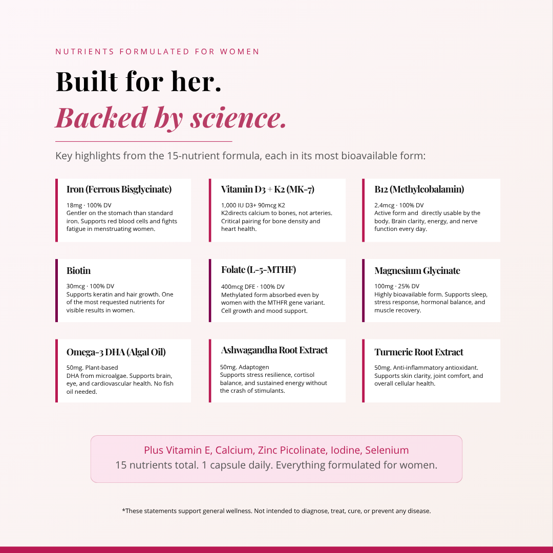 15 nutrients in bioavailable forms. Iron as ferrous bisglycinate, folate as L-5-MTHF, B12 as methylcobalamin, K2 as MK-7. Built for how women's bodies actually absorb.