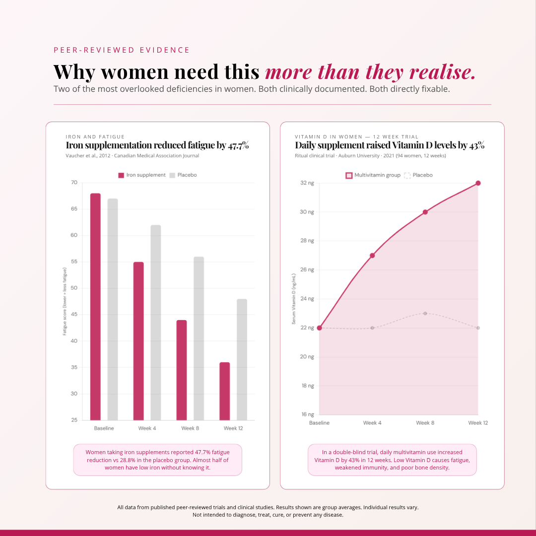 Most multivitamins are designed for the average adult male. Women need more iron, more folate, and often more D3 and magnesium. This formula is built around women's actual daily needs.
