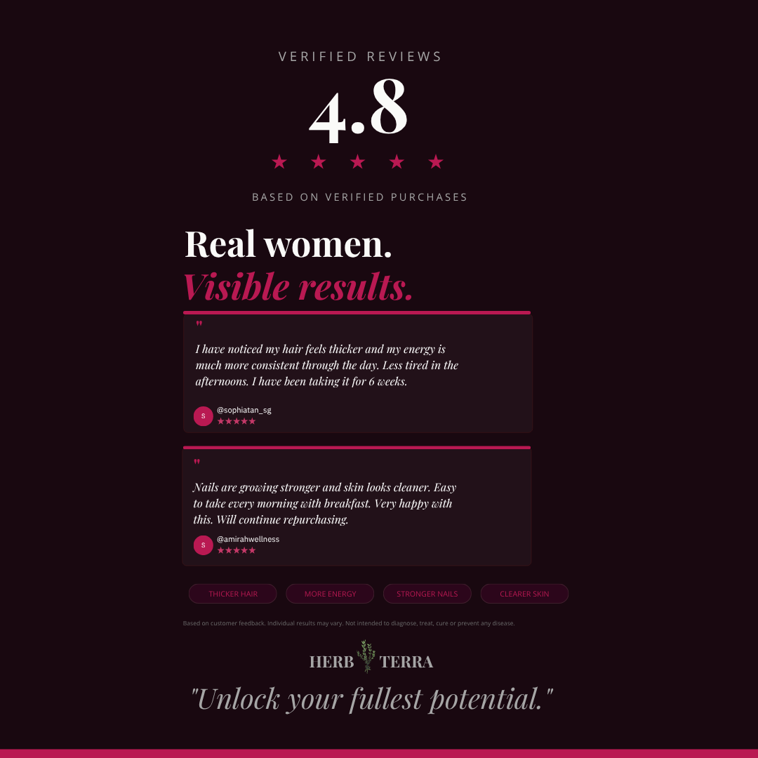 Nutrient levels build gradually. Most women notice energy and hair improvements after 4 to 6 weeks of consistent daily use. This is a long-term habit, not a quick fix.